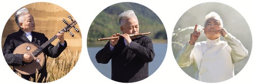 在中国南粤古驿道古曲复活工程中,方锦龙分别展示了奏阮咸、吹笛、吹簧(从左往右)。