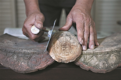 黄群庆有个“看家武器”,就是长年在全国各地收购的老瓦,找出同色系、同规格的瓦片,便可以替换掉古建筑上破损的部分。至于松散剥落的秆筋灰,清理干净淋湿润,自行调出同样色块的灰进行修复。