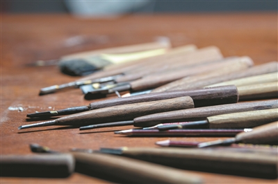 何世良手握刻刀,精心雕琢