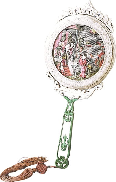 这是清代牙雕人物彩绘带柄圆镜