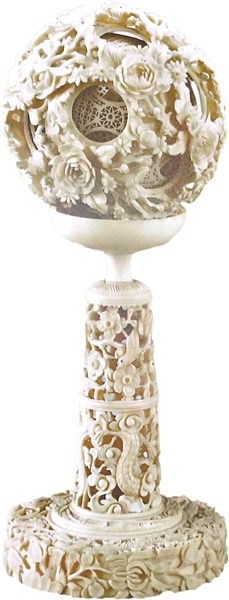 象牙球是镂雕技艺的代表作,一块完整的象牙料巧妙地镂空成层层相套的球体,被誉“鬼工球”