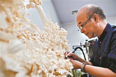 牙雕大师张民辉在创作骨雕作品