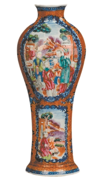 青花广彩锦地开光人物图海棠形瓶 (清乾隆)