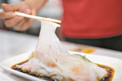 浸米、磨浆、烧水、铺布……一碟晶莹剔透的肠粉上碟之后,浇上秘制的酱汁才算完成。从厨房到餐桌的短时间内,刚出炉的余温还在,薄如蝉翼的粉皮充分吸收咸香中带甜的酱汁,一口咬下去,爽滑、鲜甜。