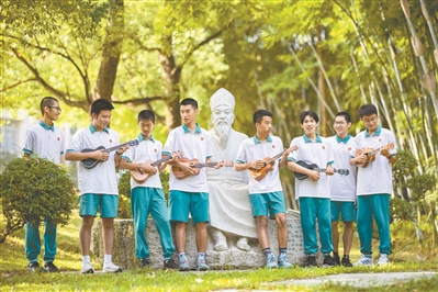 课后时间,二中学生们在校园里弹琴唱歌。
