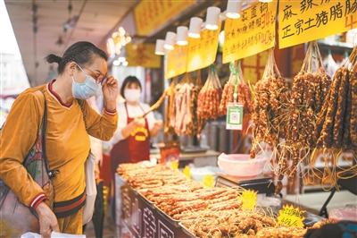 市民在菜市场挑选腊肠
