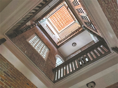 由于建筑的层高有4至5米,很多住户为了居住方便,在原本的空间布局基础上加了一层阁楼,还隔出了很多小间,天井四周也围了一圈铁栅栏。这些后加的铁栅栏,待住户全部搬离后,第一时间被拆除。一些被堵住的窗户、加建的卫生间等也被陆续清理,使建筑的本真面貌展露出来。张羽告诉记者,入口门廊等处地面被水泥和后来的地砖覆盖,修缮过程中经过小心清理,下面精美的花阶砖展露出本来面貌。庭院中部的拱券门廊上覆的现代材料被清除后,发现墙面下竟是色彩绚丽的编织纹样花砖,让大家大为惊喜。