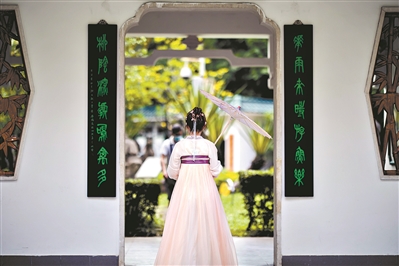 穿上汉服,与充满雅韵的园景融为一体。