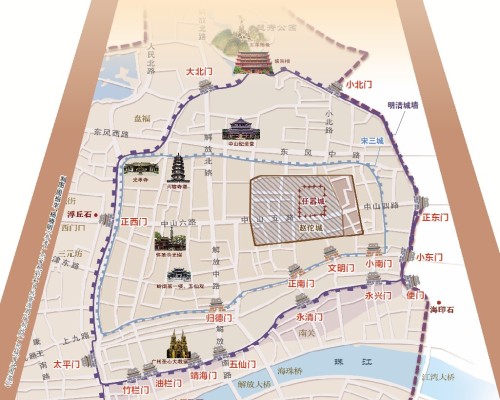 大东门、西门口、小北路、朝天路、大南路、文明路、靖海路……曾经都是广州城门所在地