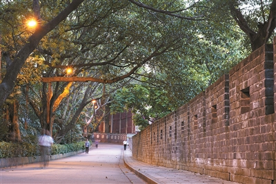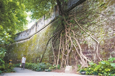 20世纪初,除镇海楼外,明城墙只剩下高低不等的残垣。1918年-1922年,广州修筑马路,这段位于越秀公园内的城墙与交通规划无碍,因此得以保留下来。1987年7月至12月,重修镇海楼范围内180米古城墙,恢复明式雉堞;2012年起,全长1179米的明代广州古城墙(越秀山段)实现边修复边开放。如今,炮火与烟灰早已随风而逝。记者沿着城墙一路走来,只见墙根下是悠然散步的市民,还有人在踢毽子、下棋、跳舞……蓦然回首,那石缝中冒出嫩芽的墙垣,无声诉说着岁月的沧桑印记。