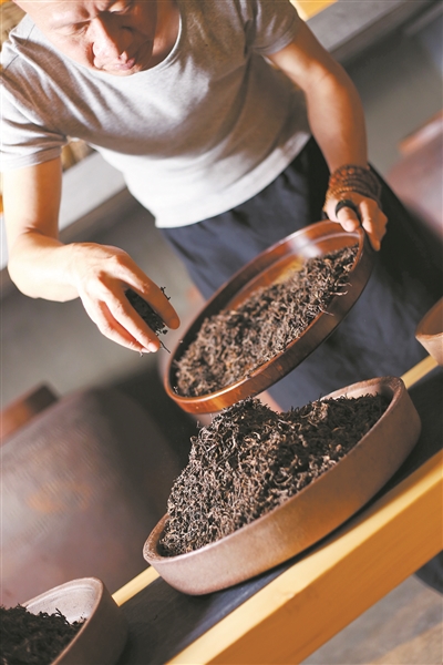 有趣的是,同样是运输途中茶叶出现变质,广州人却意外发现了加工普洱茶的奥秘。据史料记载及广东老茶人回忆,今天大名鼎鼎的“普洱茶”大约起源于清末。当时,全国各地的外销茶叶都要运来广州。其中,云南普洱的晒青茶运过来,路途少则三五个月,多则半年以上。陆路日晒雨淋,水路潮湿闷热,难免会有部分茶叶受潮,需要重新日晒加温。等到了广州,这些茶叶的外形和内质都会发生变化。广州人发现,发生变化的茶叶经冲泡后,茶汤之味厚重醇和,汤色由黄绿变得红亮,还有淡淡陈香。于是,一些人仿效此法,将晒青茶放入湿度较大的地窖储藏,或将原料加水后,装包放入仓库储存,且定期倒出来翻包透气、散热,历经一两年时间的“后发酵”,形成独具特色的“广东茶”,因原料茶叶多产自云南普洱,遂取名“普洱茶”。