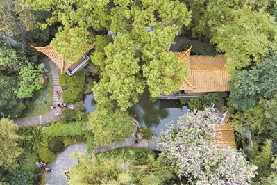 同时,林园部门因地制宜提升观景体验,在芳华园、同馨厅西边水系等特色景点增加喷雾效果,形成“云雾”缭绕曼妙景观;在水塘放置乌篷船和仙鹤雕塑,增加水景的古朴质感和生机活力。此外,林园部门还增添笔墨营造雅趣节点,在同馨厅、松皮亭、春光亭、茅舍等历史建筑增加名人书画,用翰墨赋予兰圃更加浓厚的文化底蕴。