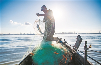 莲花山渔港,渔民下网捕鱼