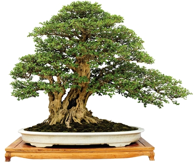 莫珉府是“自然型”盆景的创建者,他善于借鉴国画构图创作盆景,构图活泼多样,野趣盎然,虚虚实实,对比鲜明。其作品有的一边完全空出,只留一边支托,甚至整体重心偏移,人们乍一看会觉出乎意料,再一想又觉合乎情理。