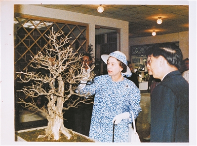 1986年10月18日,英女王在流花西苑欣赏盆景