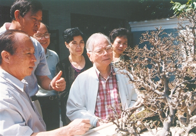 1999年10月,著名画家关山月等在观赏一株百龄盆景树