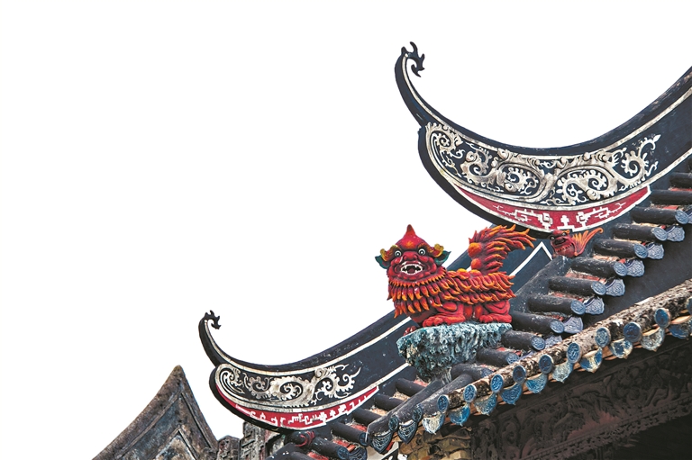 番禺区余荫山房内,不少建筑的正脊为“龙舟脊”样式。这种屋脊造型因与龙舟相似而得名,常以灰塑浅浮雕的卷草纹装饰,或者在脊的两端各置一条鳌鱼。垂脊的脊首部位也往往装饰有脊兽,有人称之为嘲风,也是龙子之一。