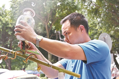 飘色艺人制作“色梗”。