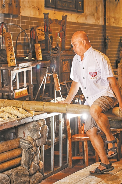 爽口弹牙的竹升面赋予了广式云吞面灵魂。“做面就像练功夫。”吴锦云向记者演示了开粉、揉面、压面、打面、切面的非遗技艺。只见他将10斤面粉倒在案板上,用手轻轻一推拉,在面粉中间挖出一个洞,随后加入5斤鸭蛋和碱水,接着缓缓搅匀蛋液和碱水,开始揉面。他说,开粉不加一滴水,就靠鸭蛋和面,能让面条充满蛋香。面团和好后,放上案板,一根长竹竿的一头压在面团上,他骑坐在竹竿另一头,控制脚尖蹬踩地面的力度,一边弹跳,一边移动,直到压出弹性十足的面团。吴锦云12岁就跟着爸爸学做竹升面,一晃几十年,这碗面也慢慢沉淀出最美妙的味道。
