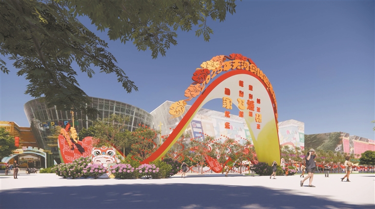 今年将在宝岗大道花市出入口处搭建“海珠迎春花市”的主牌楼,滨江东、西面出入口搭建副牌楼。2025年海珠花市牌楼以“海港古韵,灵蛇献瑞”为灵感,保留传统建筑韵味的同时融入现代设计元素,参照传统古建大宅的空间布局以及港口吊机和航标塔的形象,体现海珠区作为海上丝绸之路重要港口的历史地位。