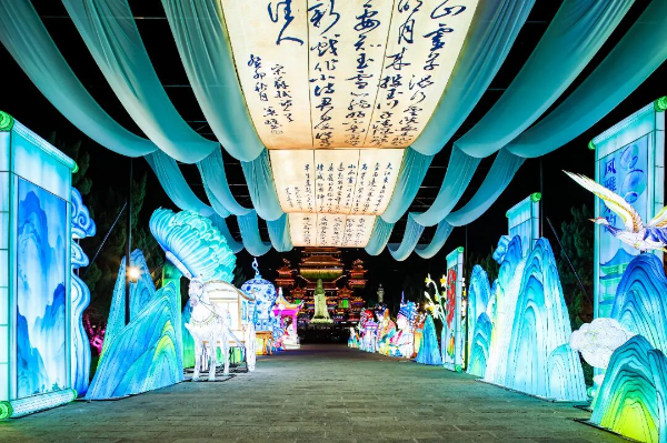 在“千年一梦·烟火人间”展区,秦汉长歌灯组还原了古丝绸之路的盛景,驼铃声声(通过定向音响模拟)与秦小篆、汉赋等文化符号相得益彰;唐宋风华灯组以苏轼“明月几时有”、辛弃疾“东风夜放花千树”等经典词句为魂,通过激光投影让游客“行在诗中”。