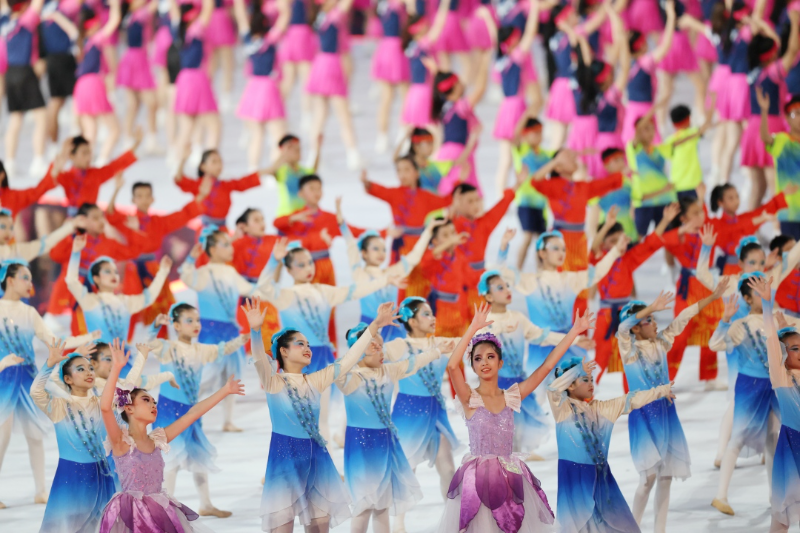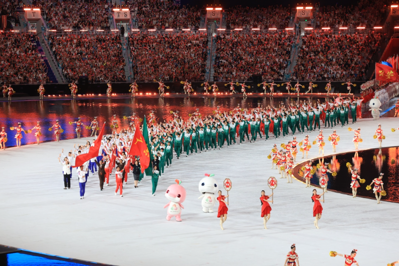 开幕式分体育仪式和文艺展演两个环节。其中,在体育仪式环节,共有38个代表团的裁判员、运动员入场;文艺展演则以“圆梦未来”为主题,分为“同根同源”“同心同缘”“同梦同圆”三大篇章。