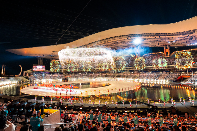 金色的烟花从上空倾泻如注,开幕式场馆绽放奇光异彩,开启一场人们翘首以待的视听盛宴,也开启了即将来到的体育盛会。
