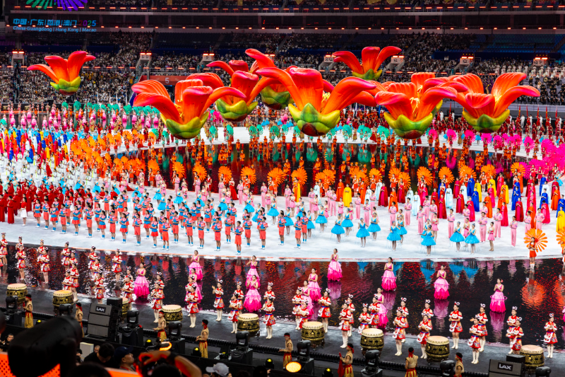 作为道具的花朵也贯穿全场:在水中绽放的花朵、旋转中五彩缤纷的花朵、场馆半空飘浮的巨型红木棉……当400名演员背着代表本次运动会会徽的三色风车出现时,青春洋溢、充满动感,三色花朵齐齐盛放,彰显粤港澳大湾区统一的岭南文化不分家、协心同办全运会的理念。