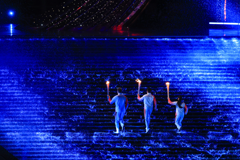 点火环节中,当第七棒的三名火炬手接到火炬时,火炬塔的台阶上倾泻而下“海水”,蓝色灯光铺上台阶上的水,并打亮穿透形成特别、奔涌的浪花。三名火炬手踏浪而上,这一刻,海水仿佛为他们开路,创意十足、特色鲜明。