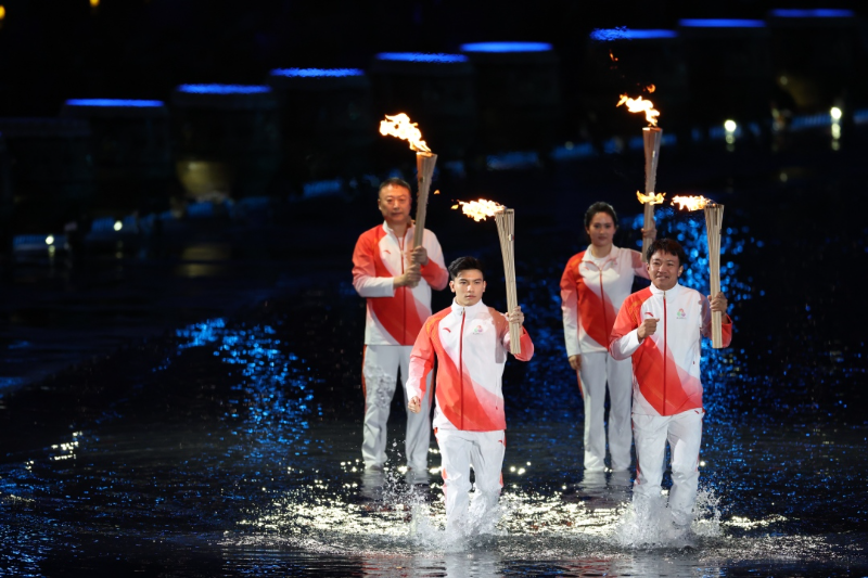 当最后一棒三名来自粤港澳的火炬手手执火炬,来到主火炬塔前时,“海水”从主火炬台上沿着台阶缓缓流下,星光投影在台阶上,如海浪涌动、熠熠生辉。三名火炬手同时举着火炬,拾级分海而上。