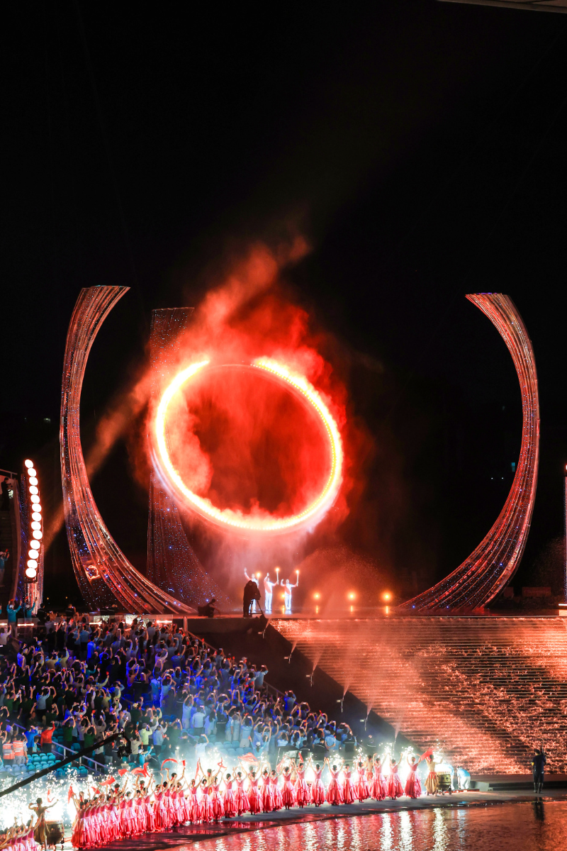 在奥林匹克中心体育场,首次将同心圆与水面舞台结合,借助环形水幕舞台等前沿舞美技术,在体育场内“造出一片海”,打造出沉浸式的海洋盛境;“同心圆”意象与体现岭南特色与海洋文明的水舞台灵动特质相融,营造出极具美学特质和哲学意蕴的艺术空间。