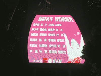 “你的名字,我们的荣光!”20日晚,英雄的名字写在了广州城市的地标!为迎接返粤的广东援助湖北医疗队队员,当晚七时起,由中共广州市委宣传部指导、广州日报发起的“你的名字,我们的荣光”活动正式拉开序幕。广州塔、海心沙8块帆屏、猎德大桥、广报中心、花城广场、广州国际媒体港、北京路、流花展贸中心等广州多个地标齐亮灯,用致敬海报和分批播放队员名字的方式向战“疫”归来的广东援湖北医疗队英雄致敬。据了解,队员名单近期将持续在广州各大地标大屏播出,市民可关注留意。