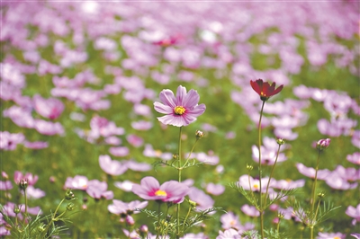 这次花展种植波斯菊约6个品种,共计10万多株,其中管状波斯菊和重瓣波斯菊的姿态尤为特别。粉色的花瓣,有些白里透红,有些粉中泛白,亭亭玉立于园区的各个角落,娇俏美丽。