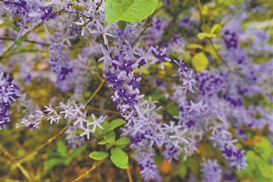 绿草丛中斜卧着一大株盘根错节的藤本植物,沿着藤枝花环状的长满蓝紫色花朵,远远望去由高往下抛物线状向草地延伸,看惯了各种大朵红花之后,走近这株正值盛花期的“蓝花藤”,一下子被这么美丽的蓝紫色所惊艳。记者5月11日在广州华南植物园见到这种观赏植物,它的老家在墨西哥、西印度群岛及中美洲。自从引进中国后很快就在南方声名鹊起成为网红。目前,“蓝花藤”在广州华南植物园、厦门植物园都有栽培。