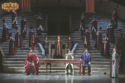 演出大幕开启。序幕中,监狱中的马可·波罗表达对中国的向往,一句唱词“鸟鸣叫在天上,云擦亮蓝天”立刻让人心情好明朗。事实上,王凯在剧中饰演的马可·波罗,戏份多到“几乎没有下过台”,他和女主角周晓琳的多首咏叹调也堪称华彩之作。