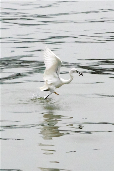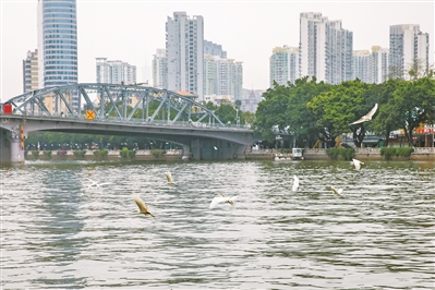 4月20日下午4时许,数十只白鹭成群结队地在海珠桥和解放桥之间的珠江江面上来回盘旋,它们时而结伴滑翔飞行、时而低飞到江面觅食。江面上出现这么多飞翔的白鹭,吸引了江边不少市民驻足观赏。他们纷纷用手机拍下白鹭在空中自由自在飞行的姿态,也记录下属于广州的城市生态美景。