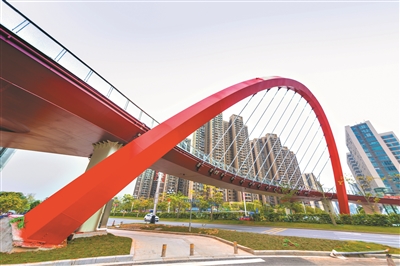 有关负责人介绍,海丝桥全长145米,主桥宽度6米。该桥毗邻海丝知识中心,横跨车九龙大道,将海丝知识中心与绿地缤纷城、高新智创园连接起来。