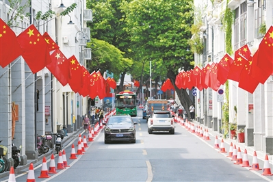 恩宁路骑楼街两旁挂满了鲜艳的五星红旗