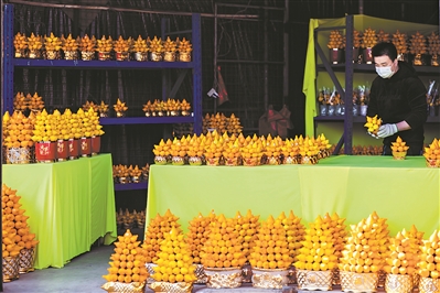 岭南花卉市场上,年宵花已经摆放好,代表“五代同堂”的黄金果灿如黄金。