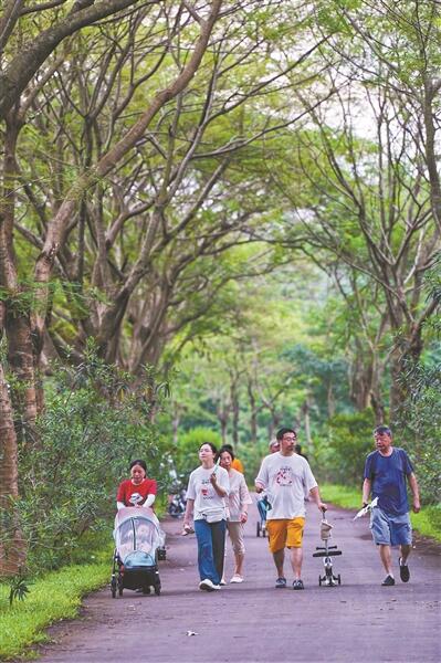 阳光正好,茂密的树林下,老老少少徜徉散步