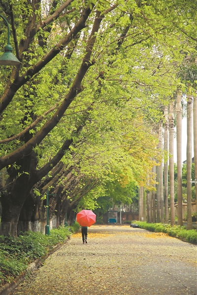 3月25日,在广州市番禺区丽江花园的一条小路上,雨后落叶缤纷景如画。气象台预计,广州3月26日白天降水减弱,转阵雨,气温下降。3月27日多云间阴天,有阵雨,气温逐渐回升。
