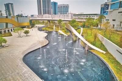 近日,记者来到万博绿地公园,看到公园内的喷泉随着音乐不停地变化造型,引得小朋友戏水嬉戏,市民拍照留念。据了解,万博绿地公园的喷泉除了造型优美,还能收集雨水,在雨季调剂水量,避免水浸。