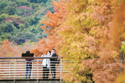 天河湿地公园的落羽杉引来市民拍照打卡