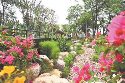 广州园林建筑规划设计研究总院有限公司第七设计院副院长王鹏程介绍,白云新城云憩里公园的建设与海绵城市建设理念深度融合,雨水花园、生态旱溪、植草沟、透水铺装、海绵泡池等巧妙融入公园建设中,这些海绵体既是公园景观的一部分,又能让客水(如雨水等)自然渗透、滞蓄、回用,实现客水微循环。不仅如此,该公园还设有AI智能动感单车、动植物标本、儿童游乐独木桩等,增强科普互动体验感,打造居民家门口的绿色公园和自然课堂。