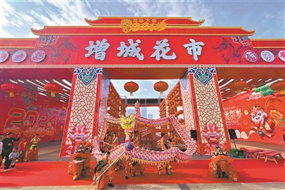 在迎春花市入口处,“增城花市”牌楼赫然在目。花市牌楼以“中国红”为主色调,展现了中华民族的传统美学,营造浓浓的节日氛围。牌楼的设计宏伟壮观,金色的龙图案寓意着吉祥和如意,反映出中国龙文化的深厚底蕴。内墙的设计巧妙地融合了龙年、花市以及增城农文旅等元素,既展示了增城的自然美景和农产品,又传递了对新年的美好祝愿。
