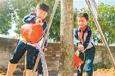 3月12日植树节当天,来自荔湾区西关实验小学海北学校的学生参加义务植树活动,为新植的树木浇水。