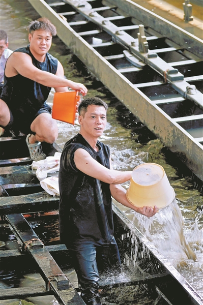 “潜龙出水”后,参与“起龙”的“桡手们”一边用力摇松船底泥浆,一边用水桶、水勺等工具将船舱积压的泥沙尽数掏出,8条龙船在众人合力之下陆续“出水”。
