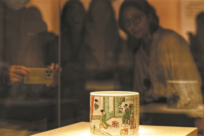 而在手工艺品当中,描绘《西厢记》场景的就更多了。其中清铜胎画珐琅“锦字传情”图盘,盘内绘《西厢记》第三本第一折“锦字传情”中的故事情节,莺莺命红娘看望生病的张生,红娘为张生传递书简;清康熙五彩人物故事图大笔筒,外腹部绘五彩开光《西厢记》人物故事图两幅,分别是“乘夜逾墙”和“堂前巧辩”……不同的器物选择了多个不同的剧中片段,可见大家对这部佳作有多么的喜欢。