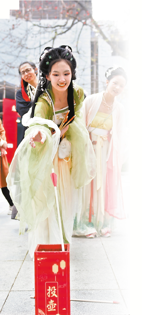 穿着汉服的“花仙子”在玩投壶游戏。