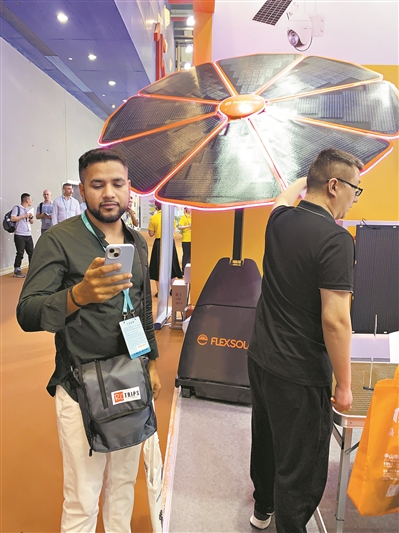 在位于广交会D区的福建天成时代新能源科技有限公司的展位前,来自孟加拉国的客商阿布·尤瑟夫足足待了一个小时。该展区主要展出了两款产品,一是庭院光伏储能系统,结合庭院、墙装和阳台的不同应用场景,免去安装商预约烦恼,用户可自行安装,即插即用,一通电便可节省日常电费;二是便携式轻量化双面磁吸太阳能板,利用新型高分子材料技术,可以适当弯曲,降低产品隐裂机会,提高产品效率。